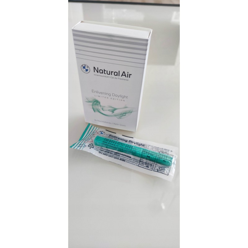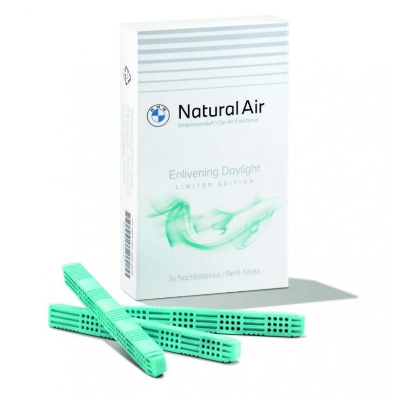Ексклюзивна концепція аромату для салону BMW Natural Air була спеціально розроблена для BMW та забезпечує приємний аромат у салоні автомобіля. Ароматні палички обмеженого випуску набору для поповнення Enlivening Daylight нагадують вам про насолоду цитрусовим коктейлем у свіжому бризі нескінченного моря, що оглядає схід сонця. Набір містить три окремо упаковані ароматизатори, які можна легко вставити у власника аромату зі стартового комплекту Natural Air.
