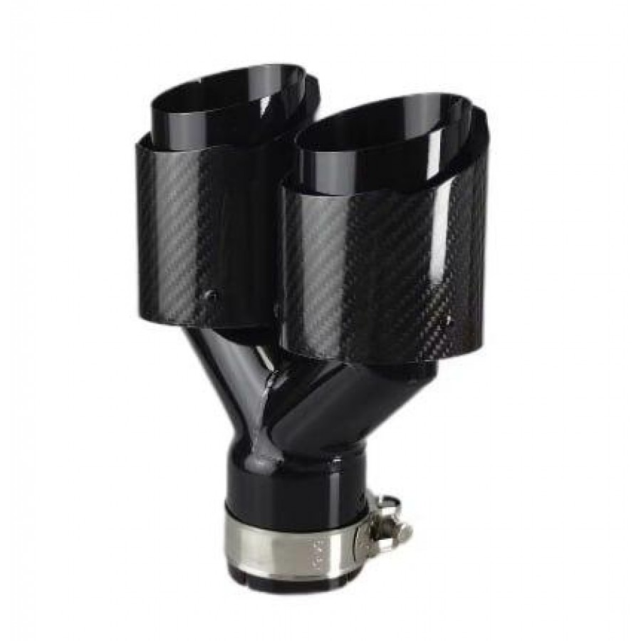 Подвійна насадка на глушник із глянцевим карбоновим покриттям для правого боку автомобіля. Універсальний аксесуар для тюнінгу, який підкреслить спортивний вигляд вашого авто. Підходить для труб діаметром 64–67 мм.