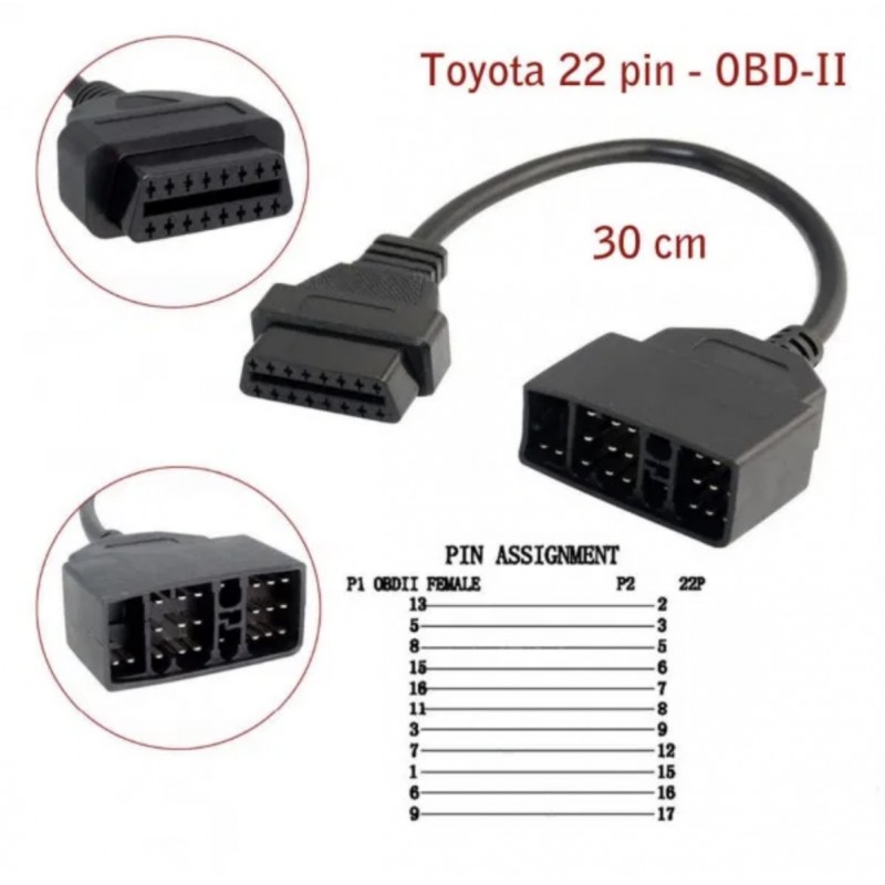 Стандартный разъем OBD II, необходимый для проведения диагностики автомобиля, встречается не во всех транспортных средствах. Иногда компании-производители устанавливают свои диагностические разъемы. Чтобы подсоединить к ним сканирующее устройство, приходится использовать специальный переходник. Адаптер OBD II Toyota 22 pin позволяет определять коды ошибок и исправлять их в электронных системах управления автомобилями марки Toyota, где используются прямоугольные 22-пиновые разъемы.