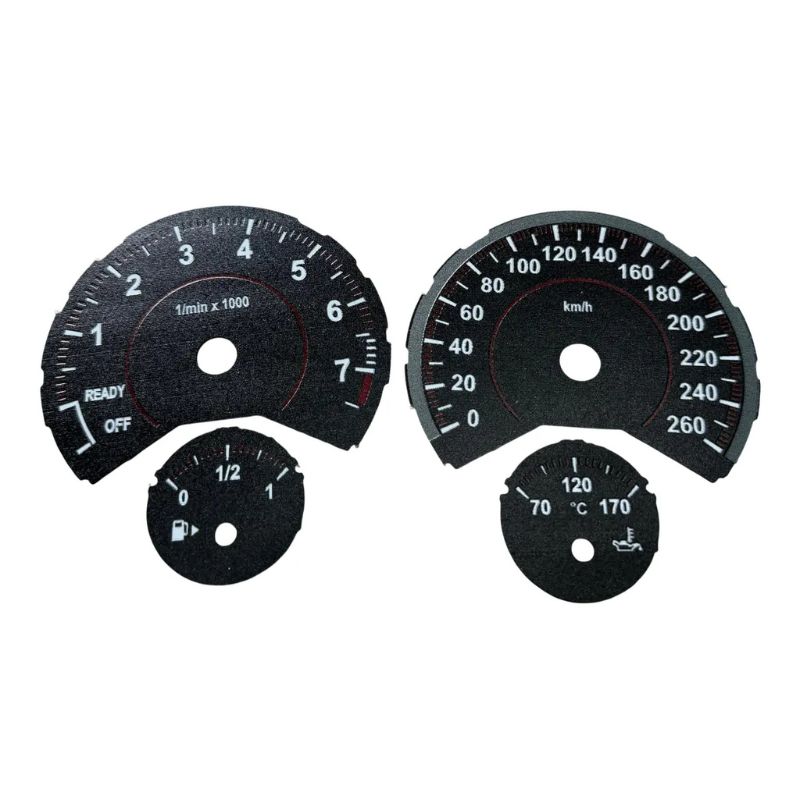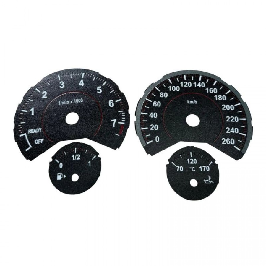 Накладка на циферблаты приборной панели для BMW F30, F31, F34, F32, F33, F36. Предназначена для замены шкалы mph (миль) на km/h (километры) с максимальной скоростью 260 км/ч.